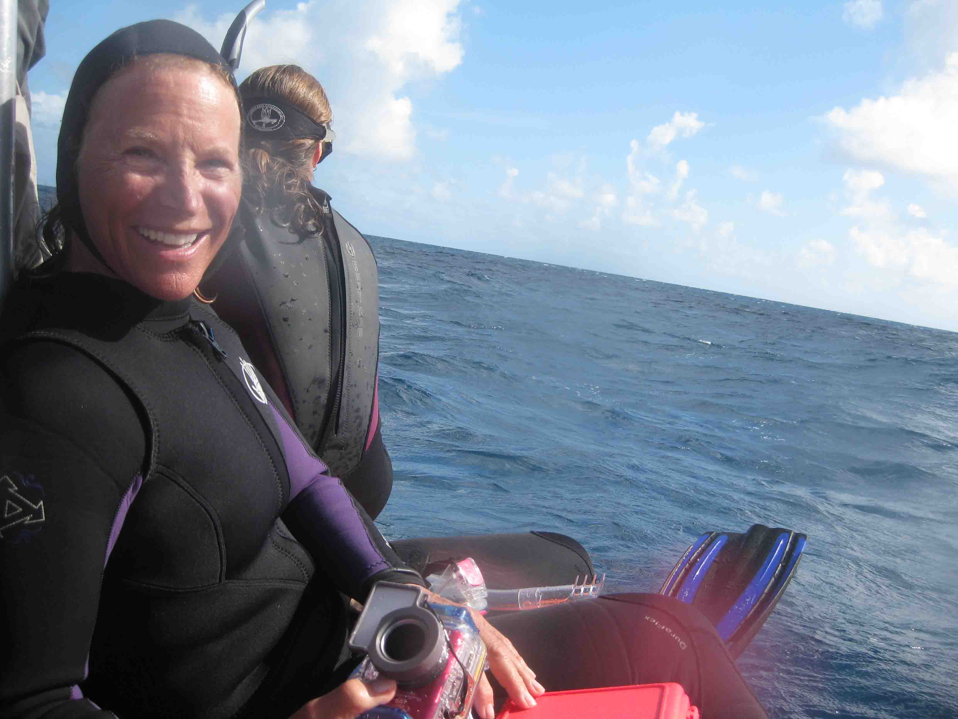 As we are traveling around in the tender, I don’t feel like I’m in the middle of the Atlantic Ocean because generally our boats are in sight, and we have to dodge corals, so it sort of makes me feel like we are near land. But the reality is, we are 125 miles off shore and there is no land in sight, so the swells can get quite large. While I don’t know for sure and they were probably smaller, it felt like six foot seas this morning as storms brewed all around us. Rain fell on the horizon and was coming toward us, but somehow we managed to dodge it. Not that it mattered, the spray of the waves coming in from all sides of the boat easily made up for it as we got soaked from head to toe!