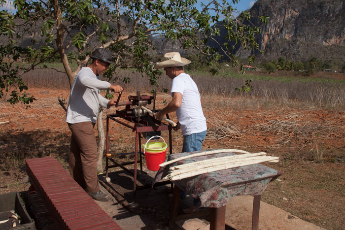Fortunately, I arrived back with time to spare and prepared to go visit the tobacco farm which I was very excited to do today. Our itinerary said we’d be learning from Hirochi Robaina. The sign we turned at said, “Finca de Referencia, Paladar Paco y Concha, Restaurant La Rosita.” Our guide called it Paco’s Tobacco farm. Wherever we were, the farm produced much more than tobacco. In fact, to protect the soil, other crops were planted as well, including cassava root, coffee, and sugar cane. The farm was also home to chickens, turkeys, goats, and pigs. If that wasn’t enough, we got try some of their sugar cane juice and coffee at their restaurant. The highlight for me was to learn how the famous Cuban cigar was made…all by hand and very labor intensive.