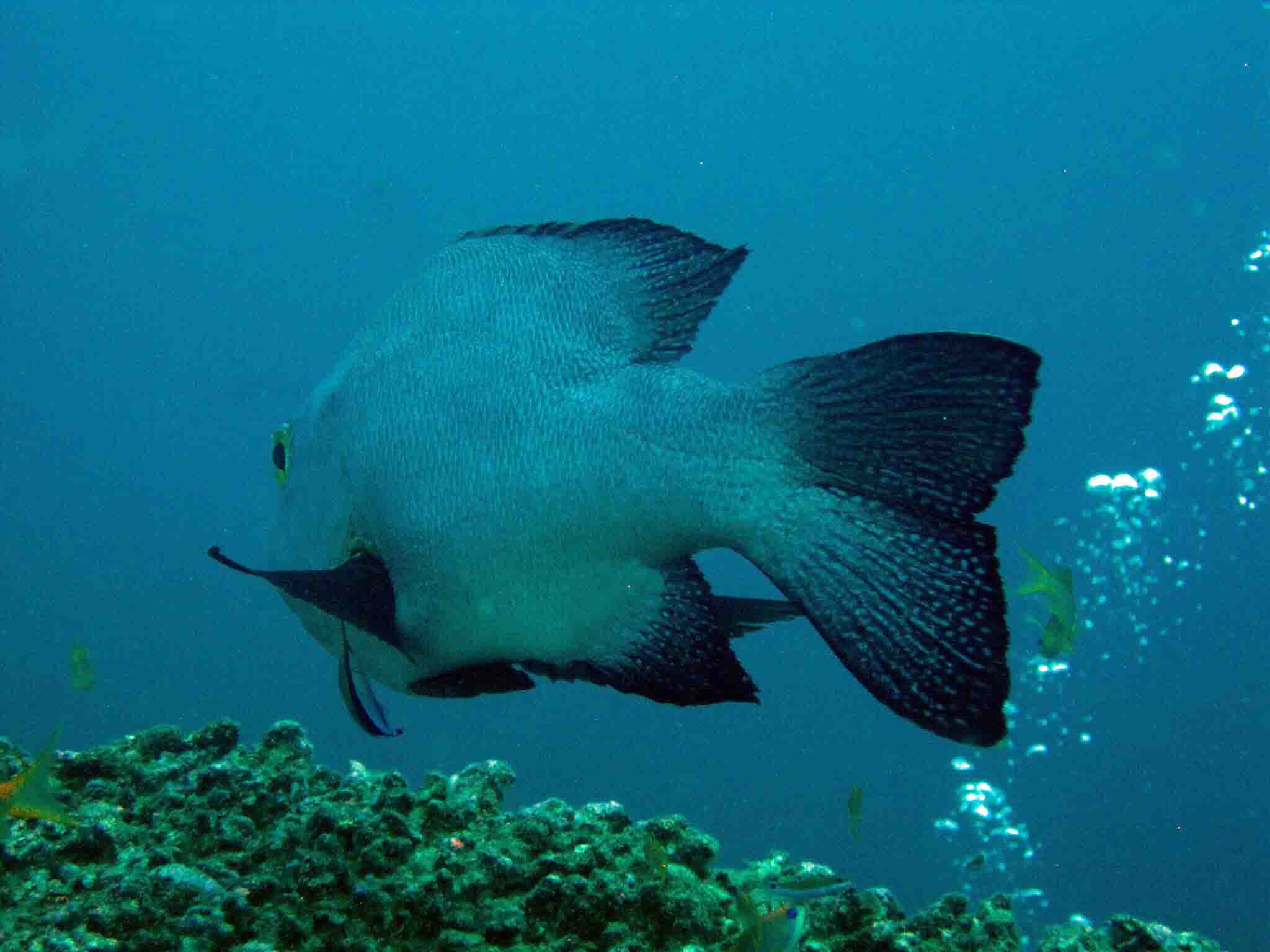 We motored south, remaining in the South Ari Atoll, to our third dive site, Reehi Thila. Reehi are the little bait fish that the fishermen use to catch tuna. They spray water off the stern of their boat, attract the tuna with the noise of the spray hitting the ocean surface, and chum the water with the little fish. Then they use poles with barbless hooks to pull the tuna out of the water. They say a good fisherman has three fish at a time. One tuna on the boat deck, one flinging in the air off the hook, and one on the hook.